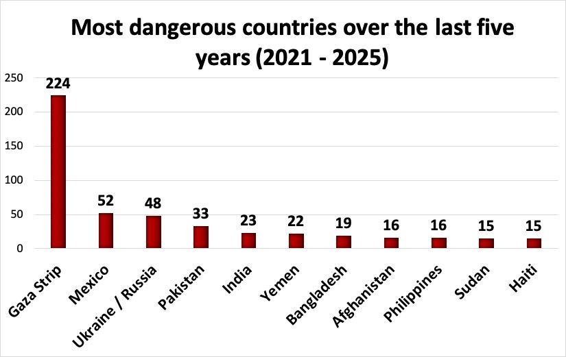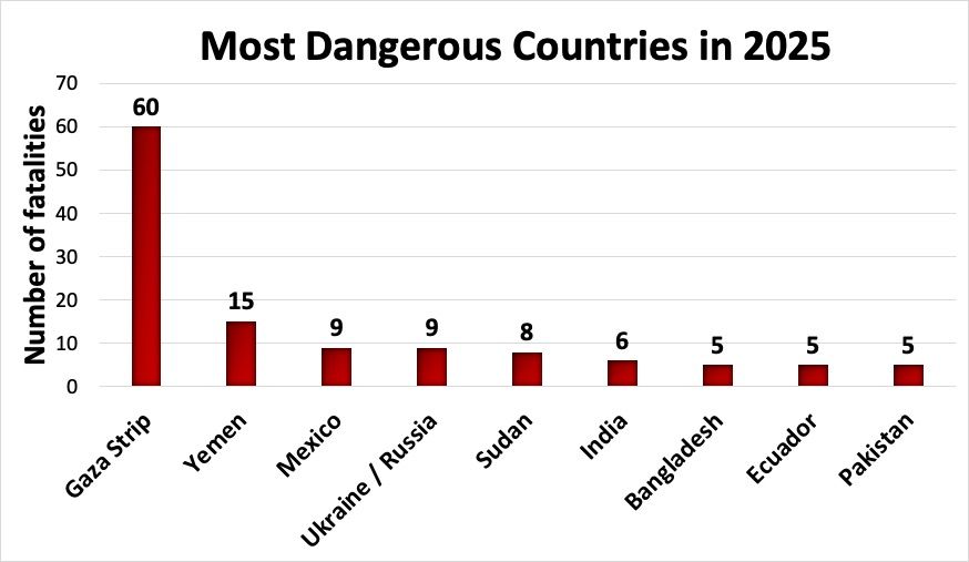 SUMMARY FOR 2025. 165 media workers killed in 31 countries. Gaza Strip 60 killed, Yemen 15, Mexico 9, Ukraine-Russia 9, Sudan 8, India 6, Bangladesh 5, Ecuador 5, Pakistan 5, Iran 4, Peru 4, Philippines 4, Syria 3, Afghanistan 2, Colombia 2, Guatemala 2, Honduras 2, Iraq 2, Lebanon 2, Nigeria 2, RDC 2, Somalia 2, Tanzania 2, USA 2, Brazil 1, Haiti 1, Nepal 1, Saudi Arabia 1, Turkey 1, Zimbabwe 1.